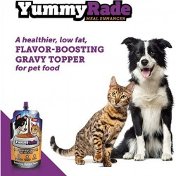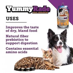 YummyRade este un potențiator de gust care imbunătățește aroma și savoarea hranei pentru animalele de companie. Oferă un plus de aromă pentru a-i ajuta să mănânce hrana uscată, dietele speciale sau doar pentru mofturoși. Ajută digestia, hrănind și promovând în același timp un intestin sănătos. Poate fi servit peste hrana normală, rece, încălzită sau congelată.